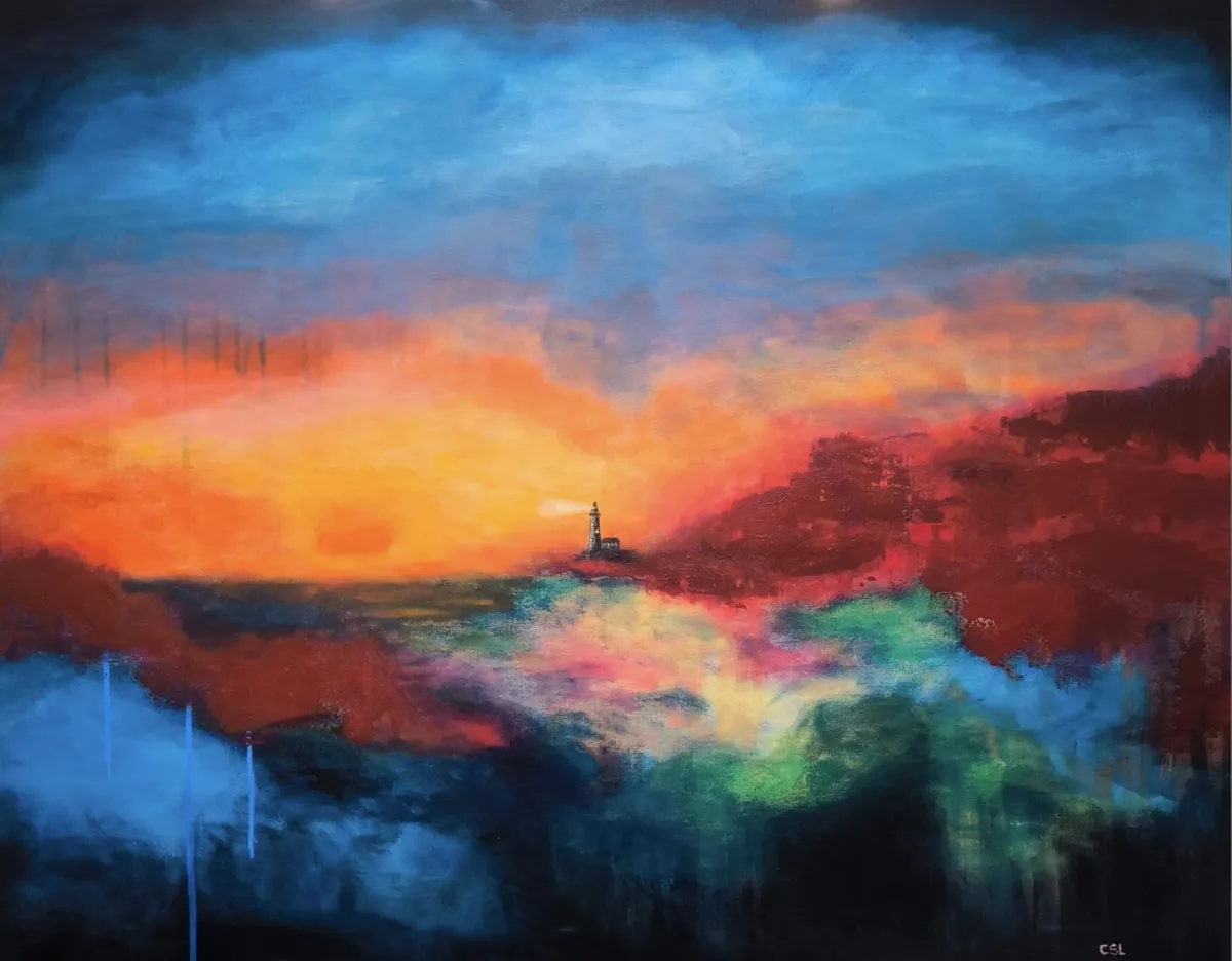 "Guiding Me Home" apresenta uma paisagem abstrata, caracterizada por uma combinação de tons fortes de vermelho, azul e laranja. O farol, elemento central da composição, é o único ponto nítido, destacando-se no meio de um fundo difuso. A obra evoca a ideia de direção e segurança, e é Ideal para quem procura uma peça com forte presença visual, que ao mesmo tempo sugere reflexão e equilíbrio.