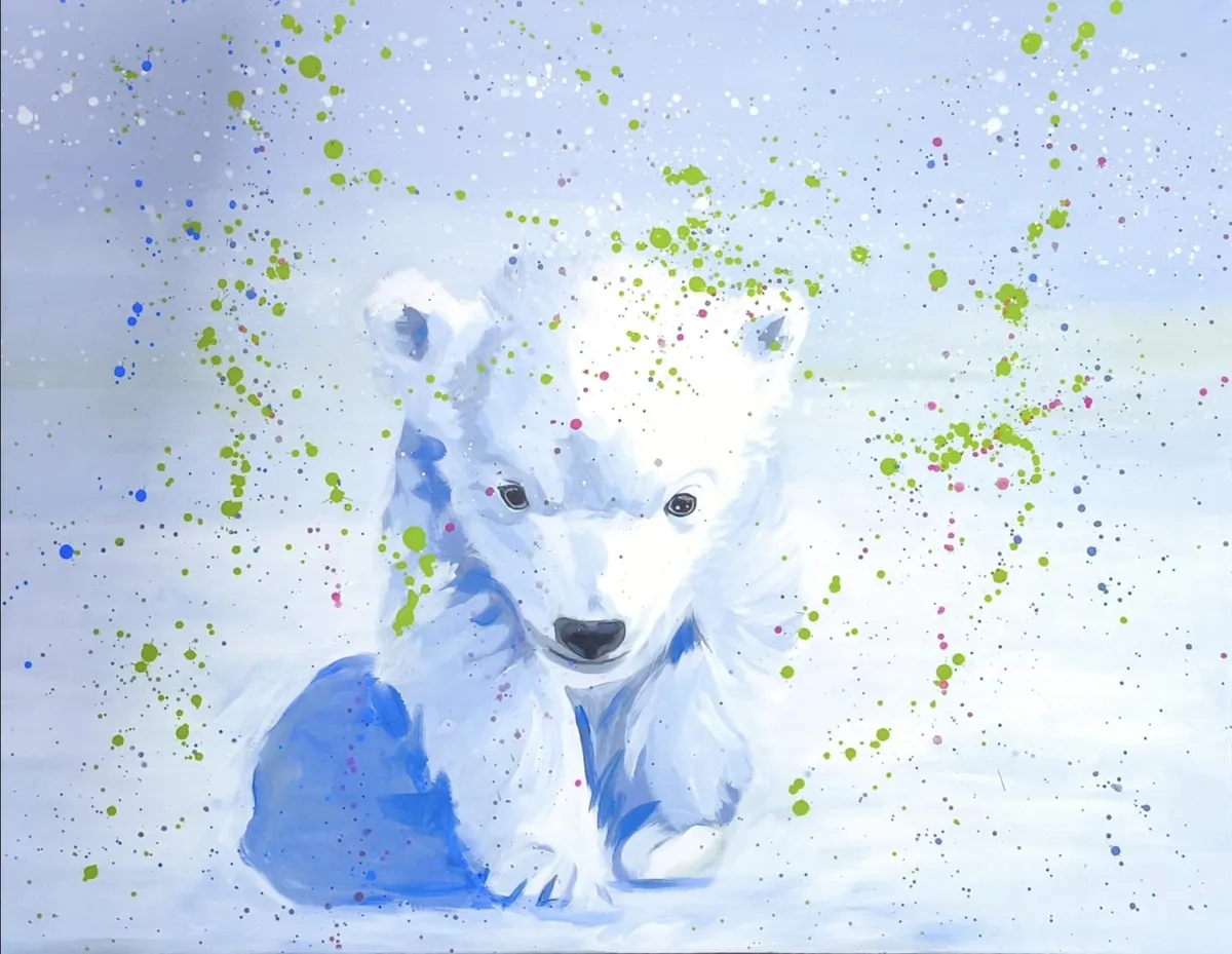 Esta pintura apresenta um urso polar bebé em uma composição expressiva, destacando sua figura solitária num ambiente de salpicos de cor. A obra captura a solidão e a força do urso polar, simbolizando a adaptação e a sobrevivência em um ambiente extremo. Ideal para quem procura uma peça de arte contemporânea e dinâmica, que traga um toque moderno e impactante a qualquer espaço.