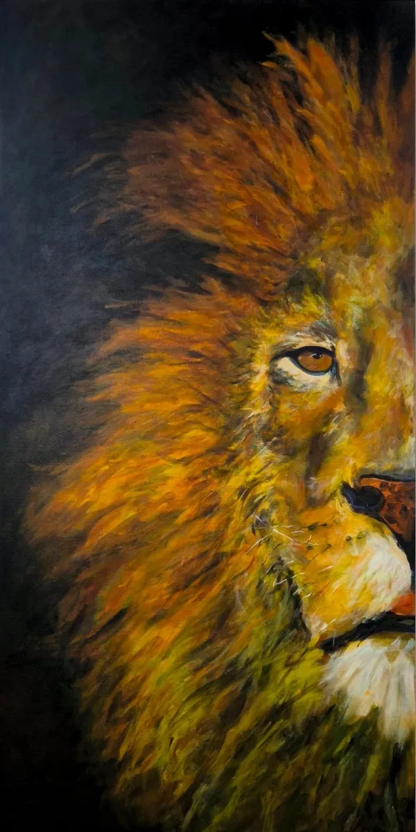 Nesta obra, o leão é representado como símbolo de força, liderança e proteção. A sua postura e expressão refletem autoridade, marcada por cicatrizes que contam histórias de sobrevivência e resiliência. Esta peça faz parte de um díptico, mas foi pensada para funcionar de forma autónoma. A sua leitura individual mantém o impacto visual e emocional, destacando a presença imponente do animal como figura central. Ideal para quem valoriza a força simbólica da natureza e a nobreza do mundo selvagem.