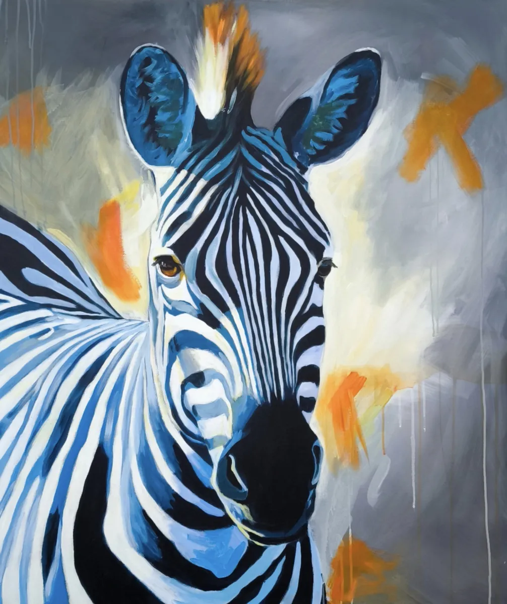 Retrato frontal de uma zebra, destacando a precisão e o contraste das listras com uma paleta contemporânea que combina tons de azul, preto e branco com acentos vibrantes de laranja. O fundo, com pinceladas livres e áreas de cor difusa, cria um contraste dinâmico que valoriza a figura principal. A composição evidencia o olhar atento do animal e a textura das pinceladas, equilibrando realismo e expressividade. O uso de cores não convencionais para realçar volumes e sombras confere à obra um caráter moderno e distinto.