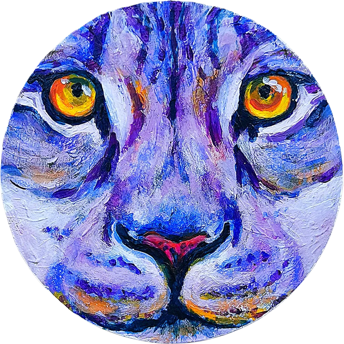 Obra criada especificamente para a exposição itinerante Gabinete Curioso: Animal. Representação da face de um leopardo da neve, reinterpretado com cores irrealistas. A escolha cromática destaca o animal como um "objeto de curiosidade". O formato circular e a frontalidade do olhar remetem para uma observação direta, com uma carga emocional intensa. A obra convida à reflexão sobre como representamos e categorizamos os animais, cruzando arte, memória e ciência.